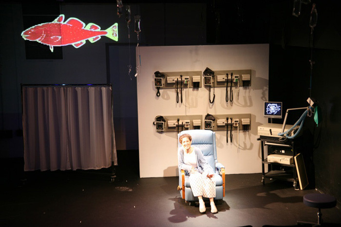 Paul Clay's Set Design, Lighting Design, and Video Design, for the production entitled Not God, a lighter moment.