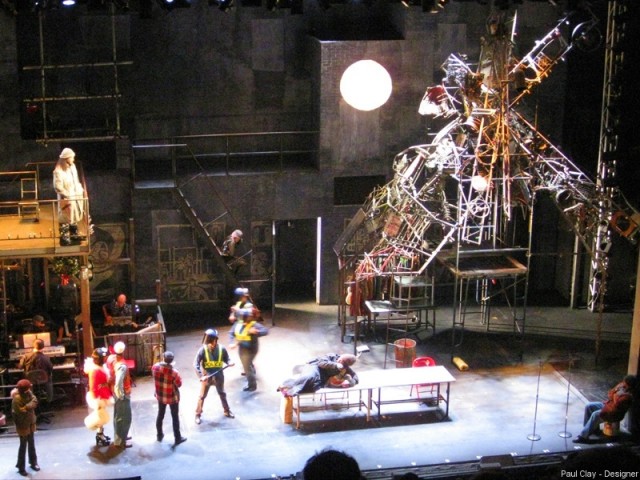 Paul Clay's Set Design, and Projections Design, for the Broadway Production of RENT, police roust the homeless, from the Paul Clay Design website.